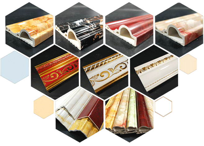 PVC装饰线条、石塑线条、装饰雕花、顶角线、踢脚线、仿大理石线条、压花线条、510平线、罗马柱、背景墙....